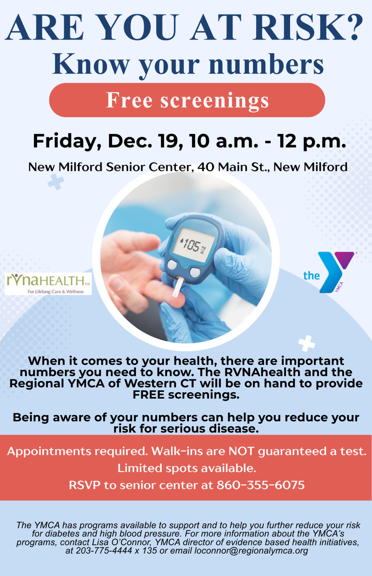 When it comes to your health, there are important numbers you need to know. The RVNAhealth and the Regional YMCA of Western CT will be on hand to provide FREE screenings. Being aware of your numbers can help you reduce your risk for serious disease.
