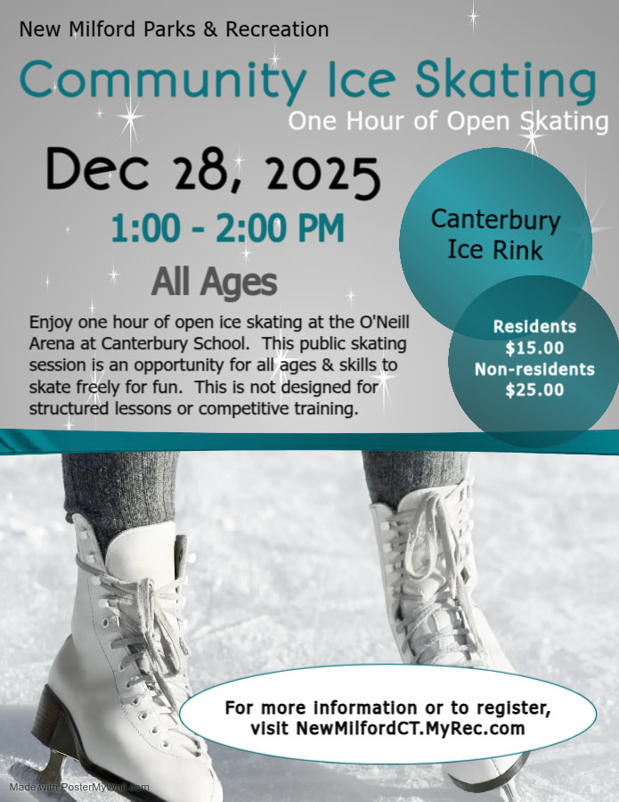 Enjoy one hour of open ice skating at Canterbury School's O'Neill Arena, 101 Aspetuck Avenue.
