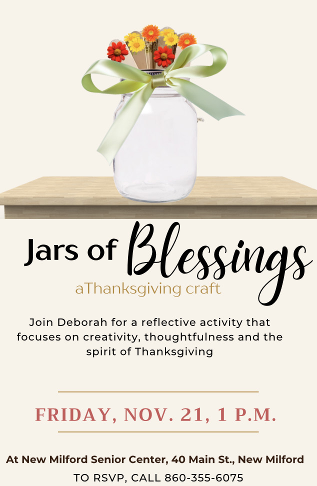 Join Deborah for a reflective activity that focuses on creativity, thoughtfulness and the spirit of Thanksgiving. At New Milford Senior Center, 40 Main St. For more information and RSVP, call 860-355-6075.