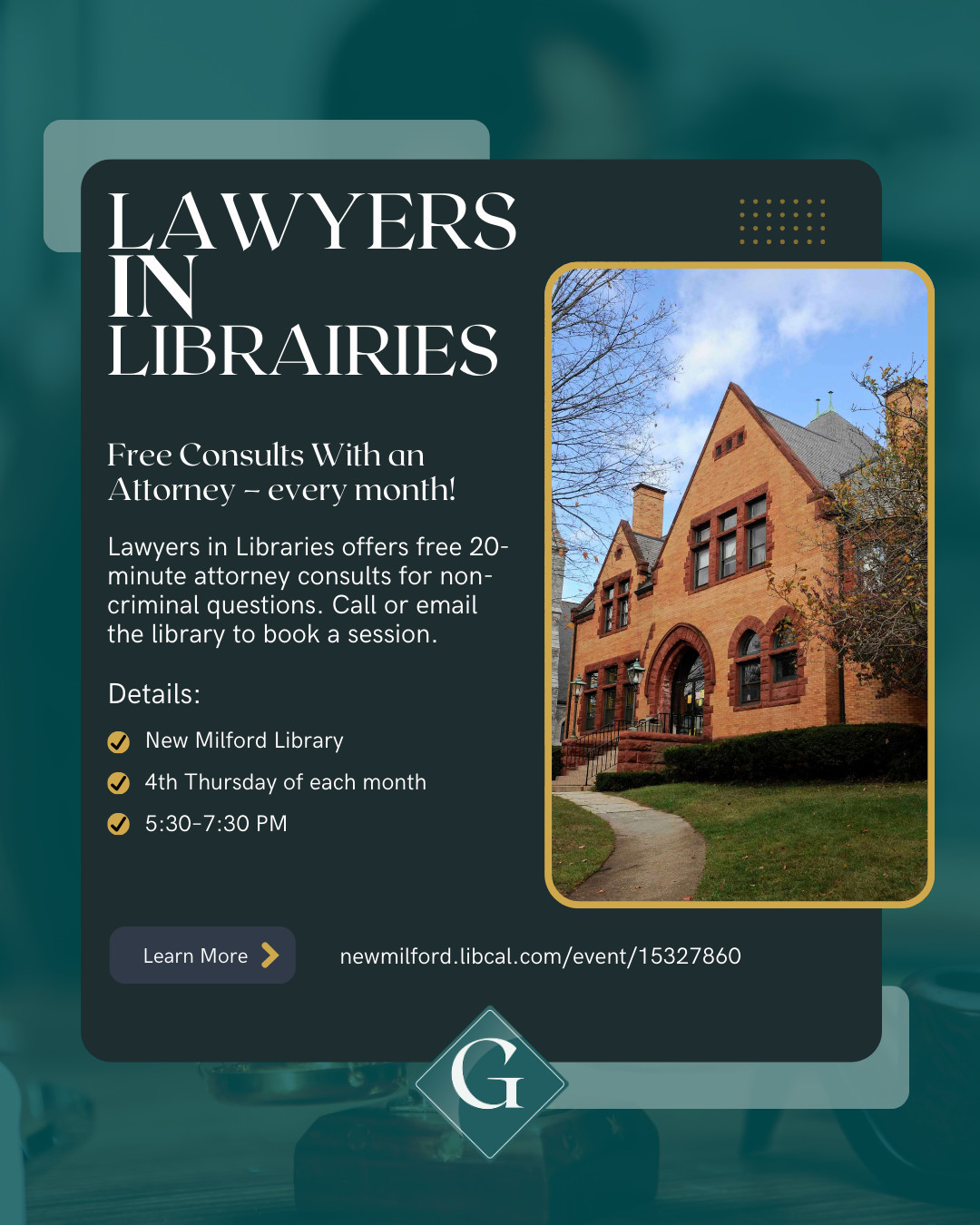 Exciting News for New Milford! Guendelsberger Law Offices is thrilled to share that the Connecticut Bar Association’s Lawyers in Libraries program is officially coming to the New Milford Public Library starting September 25!