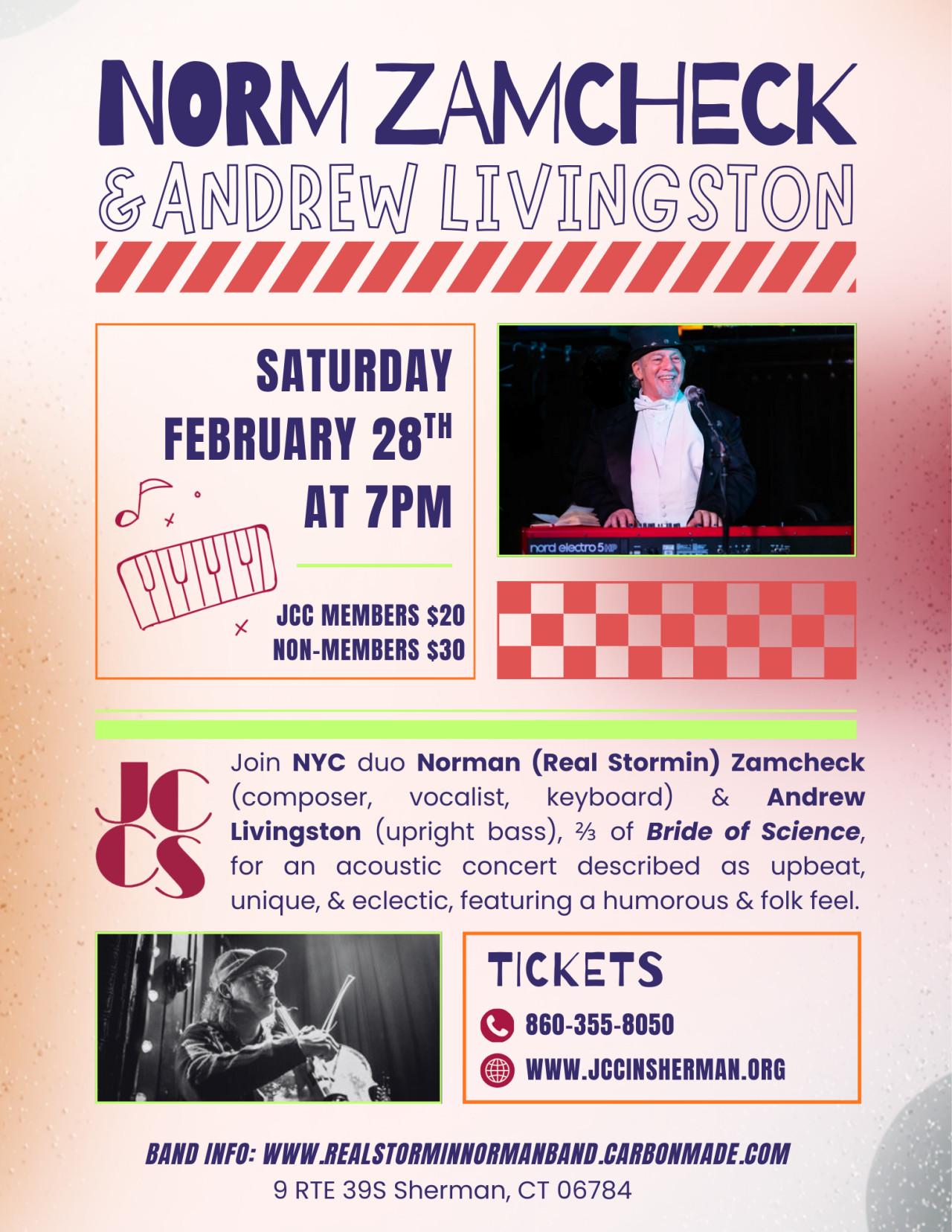 The group, Bride of Science, is the acoustic outlet of pianist composer Norman (Real Stormin) Zamcheck's prodigious songwriting outlet. - 800 compositions & counting! Norman Zamcheck & Andrew Livingston, ⅔ of Bride of Science will perform as a duo at the JCC Saturday February 28th at 7pm.