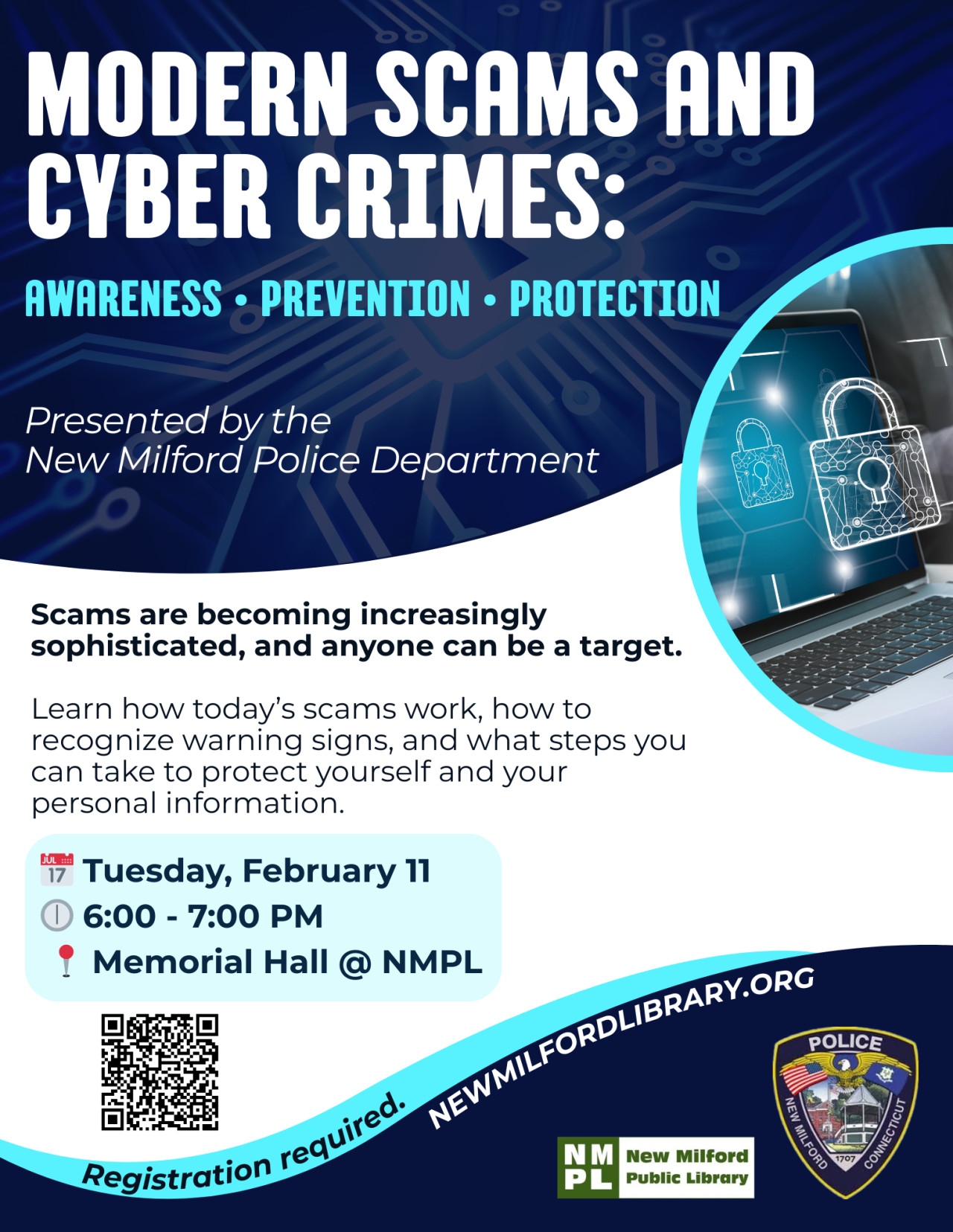 Scams are becoming increasingly sophisticated, and anyone can be a target. Join Community Outreach Officer Jake Schneider from the New Milford Police Department for an informative presentation on today’s most common scams and cyber crimes.