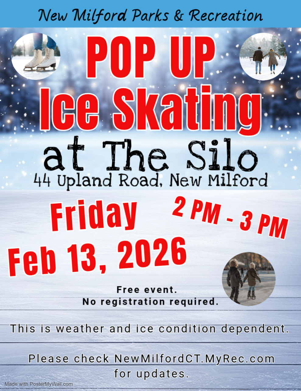 As outdoor skating on a pond is weather and ice condition dependent, please check our website, NewMilfordCT.MyRec.com, next Friday for any updates.