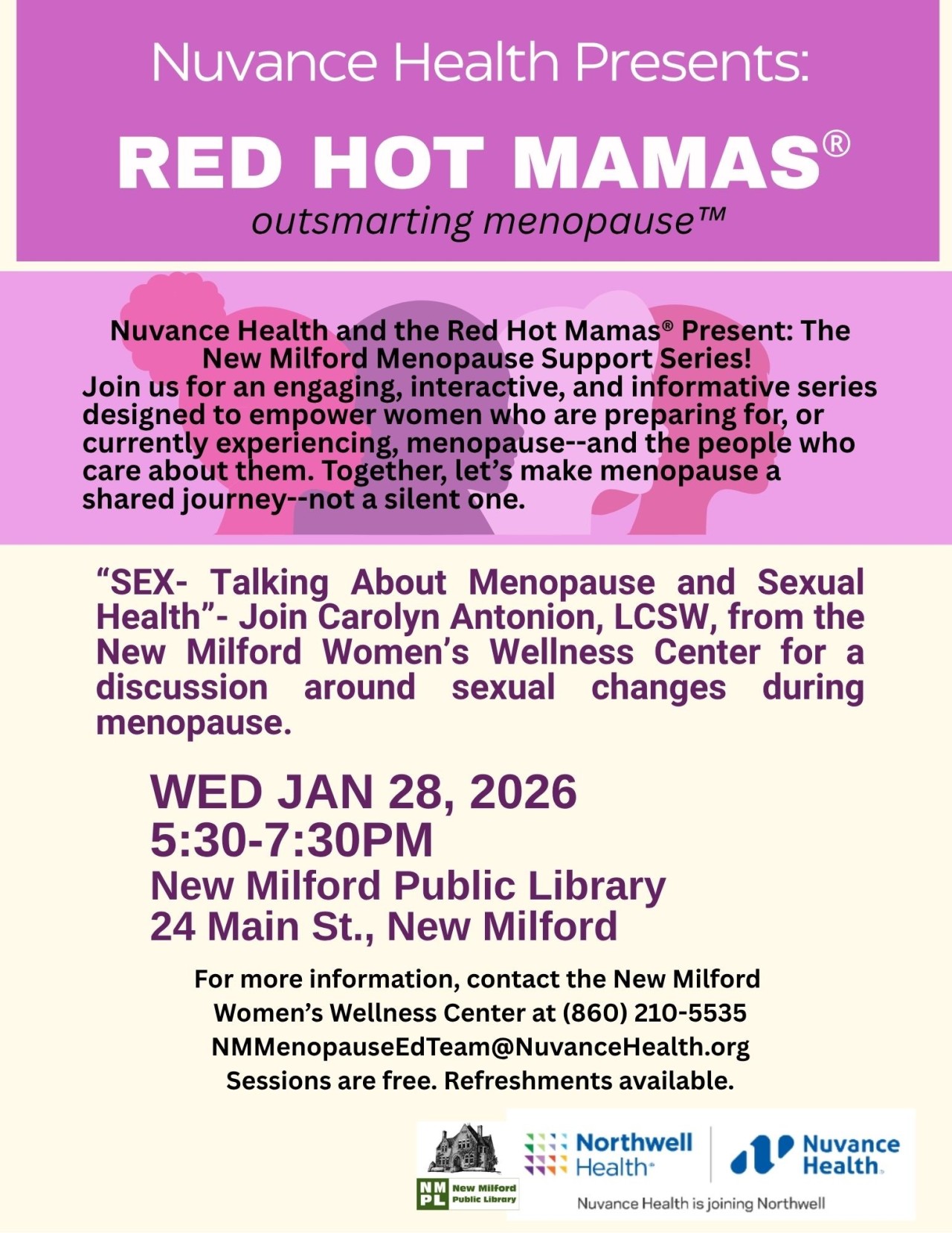 “SEX- Talking About Menopause and Sexual Health”- Join Carolyn Antonion, LCSW, from the New Milford Women’s Wellness Center for a discussion around sexual changes during menopause.