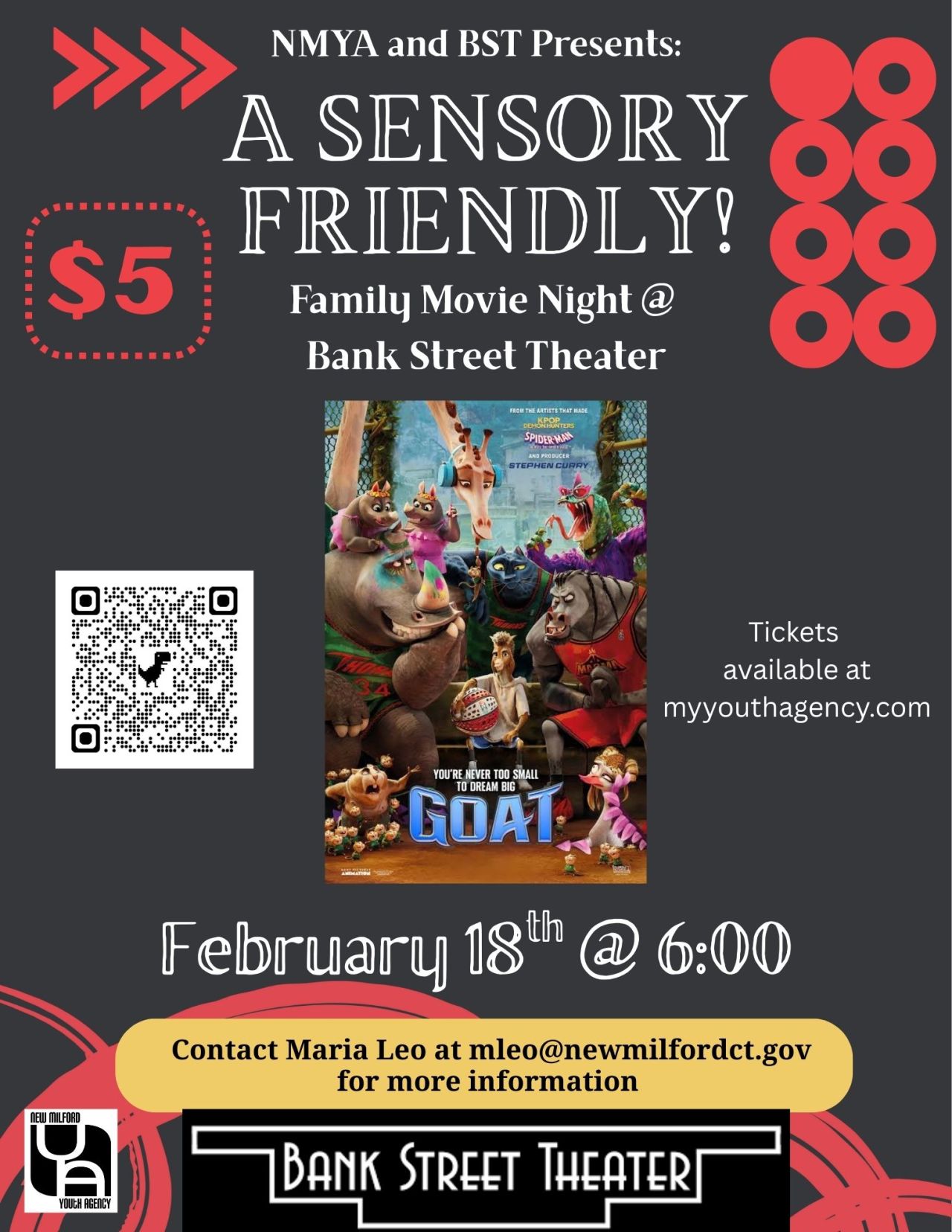 NMYA and BST presents a sensory friendly family movie night. February 18th at 6 pm Contact Maria Leo at mleo@newmilfordct.gov for more information.