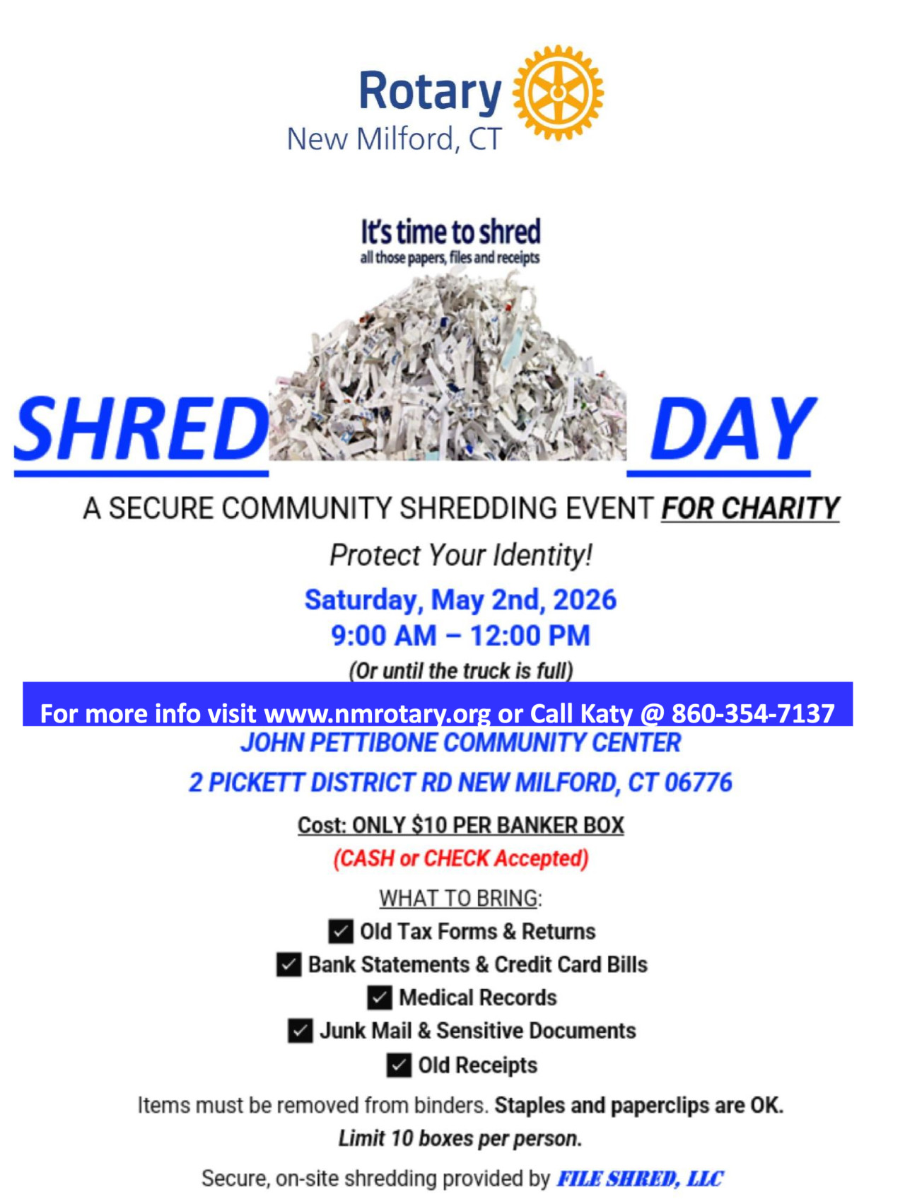 Shredding Day for charity. Proceeds go to 10,000 Meals for Hungry and Homeless. $10.00 / bankers box