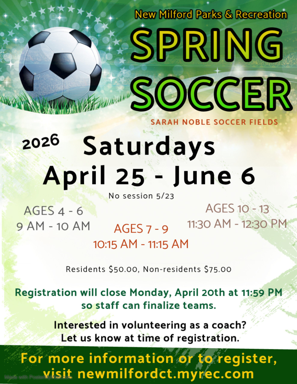 Requirements: Shin guards, water bottle. Kids are not required to wear cleats and can wear sneakers.