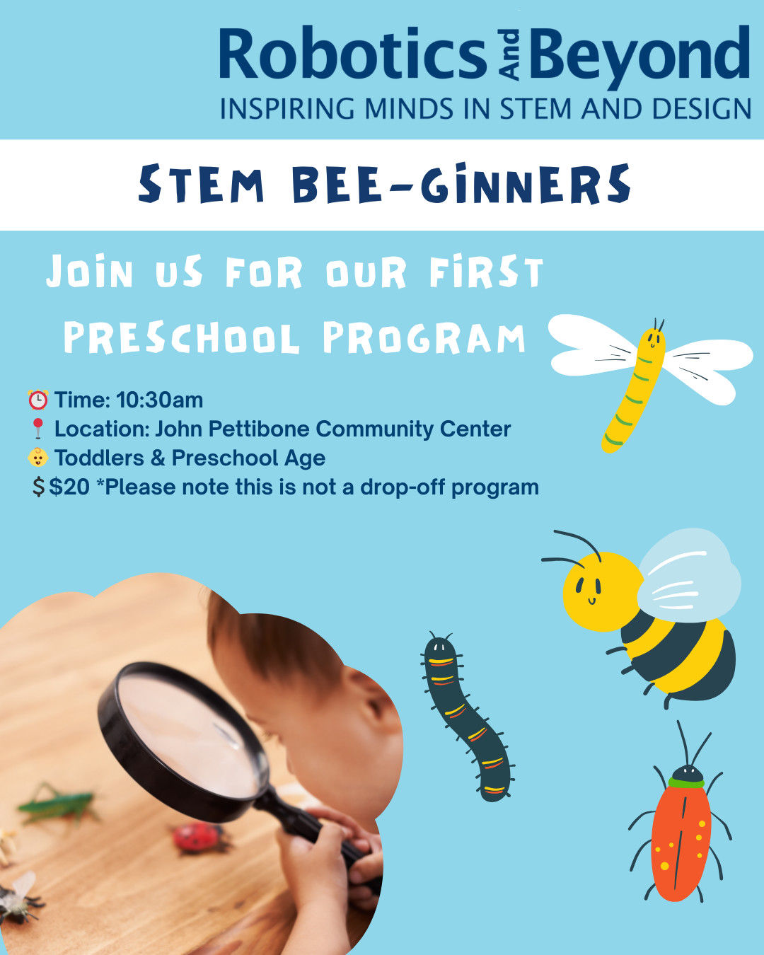 STEM Bee-ginners is a hands-on, inquiry-based preschool program designed to spark curiosity and critical thinking in young learners through the exciting world of insects, bees, and nature. Tailored for ages 3–5, this unique program blends science, technology, engineering, and math (STEM) with imaginative play, exploration, and environmental awareness. Younger siblings welcome. This is not a drop-off program.