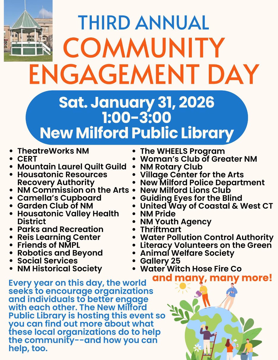 Every year on this day, the world seeks to encourage organization and individuals to better engage with each other. The New Milford Public Library is hosting the Third Annual Community Engagement Day, so you can discover what these local organizations do to help the community, and how you can help.