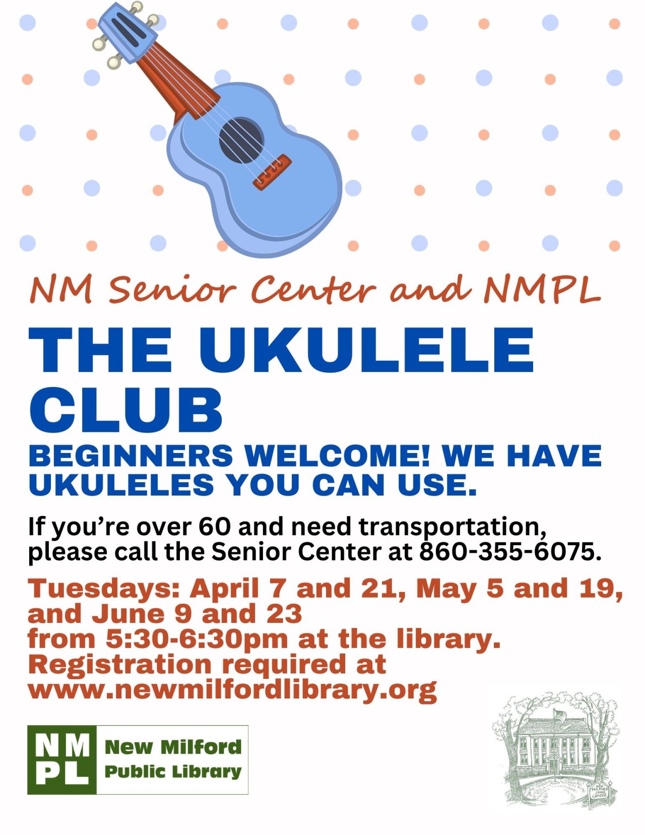 Join this club to learn the ukulele and to improve your skills. Playing the ukulele with others is loads of fun! A collaboration between NMPL and NM Senior Center. If you are over 60 and need a ride to the library, please call 860-355-6075.