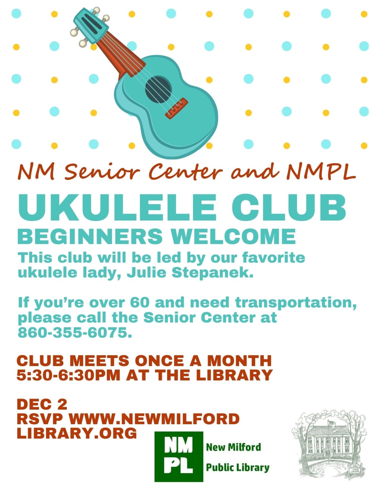 Join this club to learn the ukulele and to improve your skills. Playing the ukulele with others is loads of fun! A collaboration between NMPL and NM Senior Center. If you are over 60 and need a ride to the library, please call 860-355-6075.