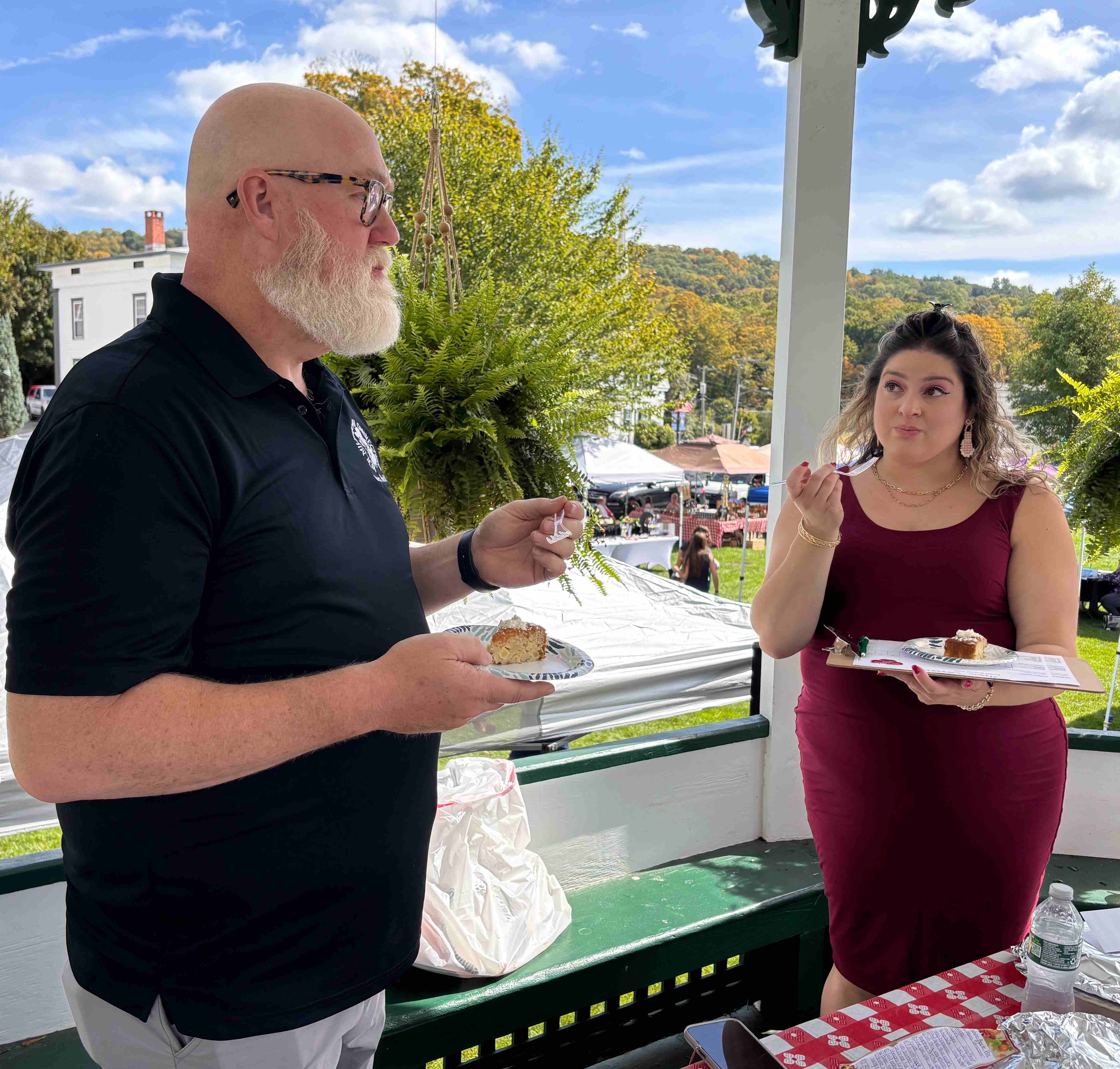 Deborah Rose/State Representative Bill Buckbee (R-67th) and Maria Koulouris, owner of Iron Rail in town, reflect on a bite of one of the baked goods during the judging of the bakeoff.