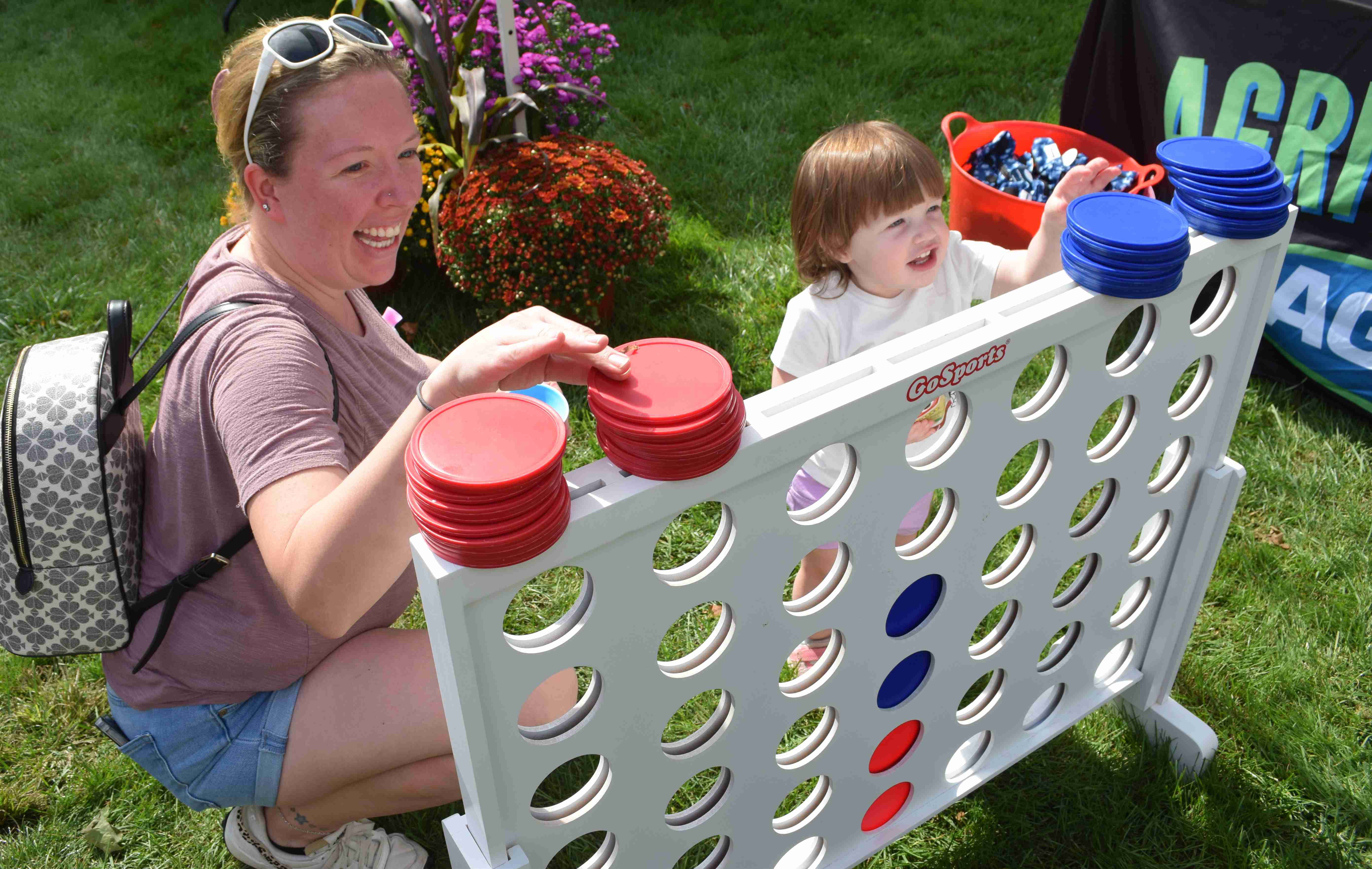 Deborah Rose/Resident Sarah McElroen and her daughter, Eleanor, 18 months, explore the Connect Four game board at the Agriventures Agway booth.
